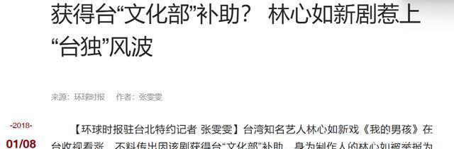 环球时报(获得台“文化部”补助?林心如新剧惹上“台独”风波2018.01.08)