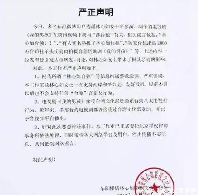 随着舆论的不断发酵,林心如工作室也发表了声明。 明确自己不是“台独”,还表示多部电视剧都有资金资助并非特殊。 虽然这件事情林心如也出面澄清,但依旧有不少的网友认定了她的身份。